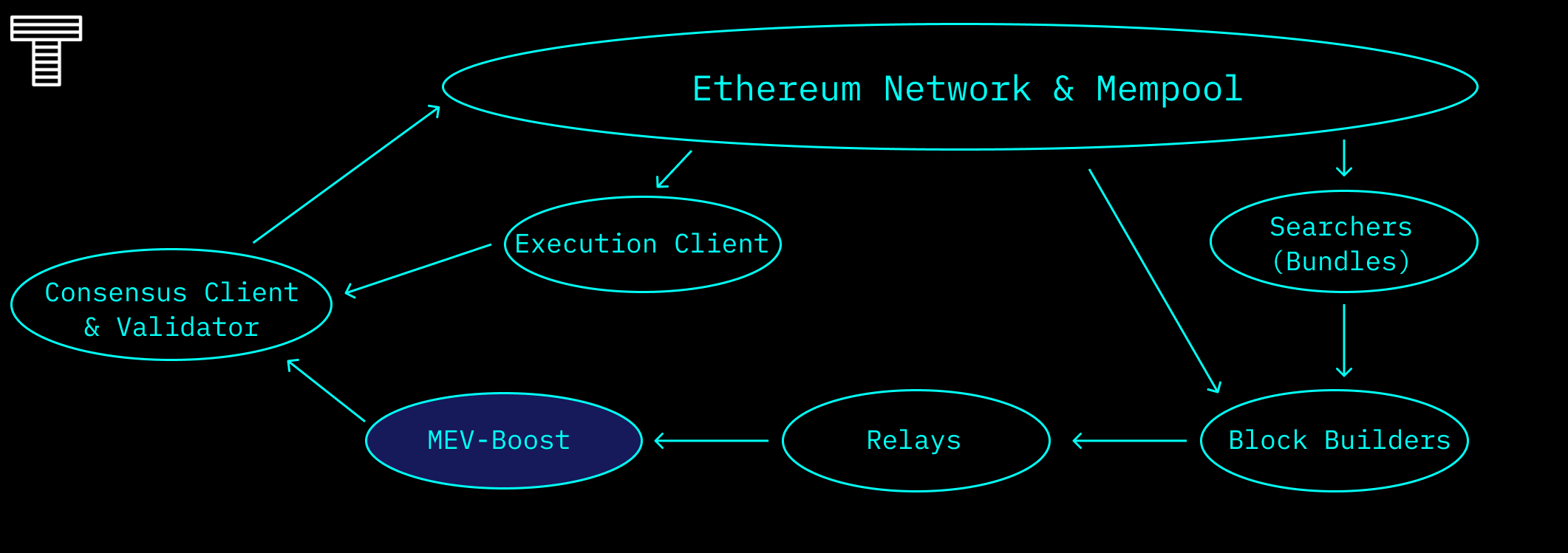 MEV-Boost 分離了 PoS 驗證者的角色:區塊建設和區塊提議。Searcher(獨立的網絡參與者,他們在區塊鏈上尋找 MEV 機會而得名)向區塊建設者發送捆綁交易,有時他們自己也是區塊建設者。