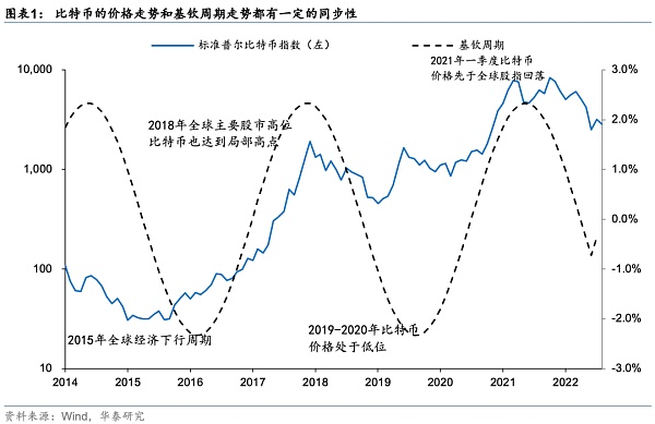 比特幣的走勢和經濟周期存在一定同步性:比如2015年全球經濟周期處于底部位置,比特幣也處于價格低位;隨著基欽周期轉向上行,比特幣在2016-2018年間一路上行;2019和2020年間比特幣價格處于近些年市場相對低位;2021年一季度基欽周期頂部位置也是比特幣近兩年的高點。