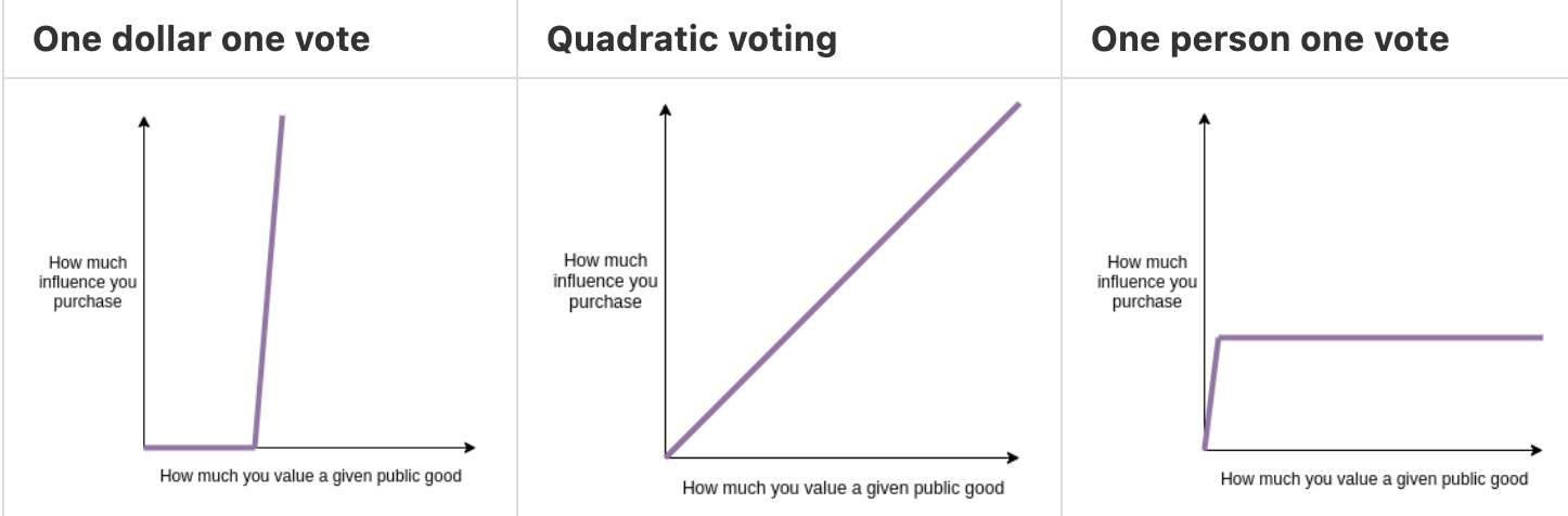 二次方民主——指基于二次方投票的治理架構,公式如下:投票者的成本=(投票數量)^2。比如,對某一提案投一票需要花費一個治理通證,但如果要投五票就需要25個治理通證。二次方投票可以防止DAO的投票結果被少數巨鯨控制。多數成員的共同投票結果將擁有同等或甚至更大的效力。然而,要真正執行二次方投票,需要建立抗女巫攻擊機制,以防止欺詐行為或將通證分散在不同錢包里。