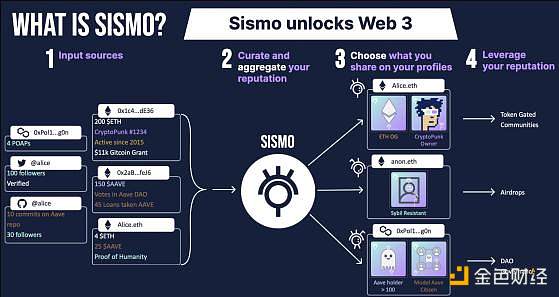Sismo 就是致力于此的項目之一,它是一個用戶體驗友好的 Web3 身份管理系統,基于依賴零知識證明的元數據加密證明。用戶可以通過 Sismo 管理來自其 ETH 地址和 Web2 社交檔案的元數據集合,通過作為游戲證明的 NFT 徽章選擇性地展示信息。