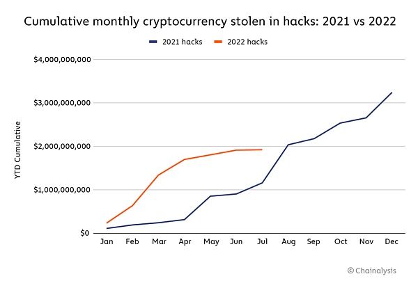 到 2022 年 7 月,有價值 19 億美元的加密貨幣被盜,而 2021 年同一時間點不到 12 億美元。這種趨勢似乎不會很快逆轉,因為 8 月的第一周又發生了兩件事:代幣跨鏈橋 Nomad 被黑客盜取了 1.9 億美元資金;黑客從 8,000 多個 Solana 錢包盜取了 500 萬美元的資金。(這兩個事件在上圖中沒有顯示,因為我們選擇了 7 月 31 日作為我們研究的截止點)。?