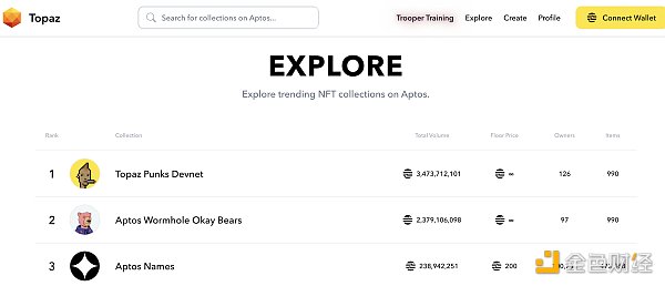 Topaz 是首屈一指的 NFT 市場,建立在 Aptos Devnet 之上,由 Aptos 團隊提供支持。