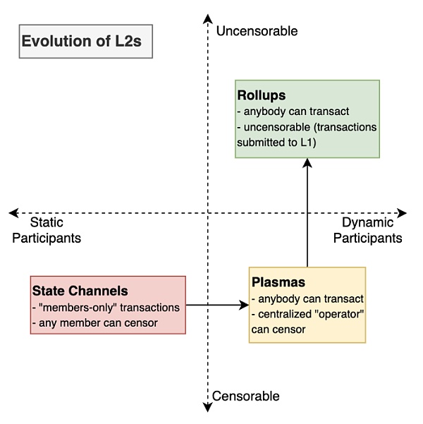 實際上,可擴展性的研究在過去六年可以歸結為一件事:什么樣的“拒付支票”可以被強制執行。首先,只有一組預先商定的參與可以在彼此之間進行交易 (狀態通道)。接著就是,任何人都可以交易,但也有可能被審查 (plasma)。終于,我們把審查問題也解決了 (rollups)。