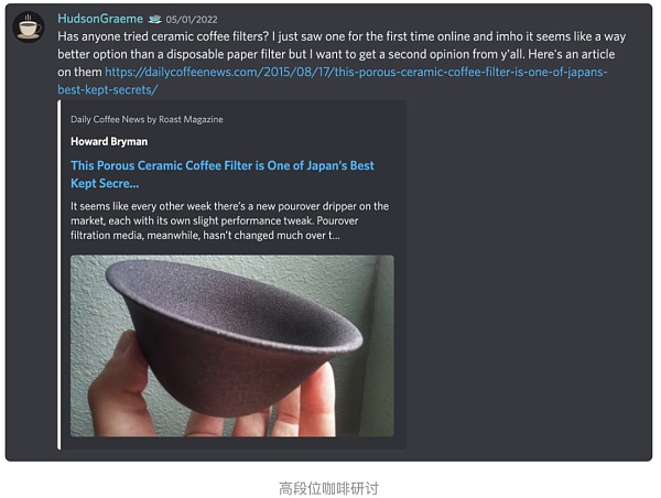 咖啡研討。喝咖啡和手沖咖啡是一部分人的愛好,項目的實體商品也是咖啡,所以也會有一些圍繞咖啡話題的頻道,如 #coffee-chat 用來分享烘焙咖啡、沖咖啡的知識。