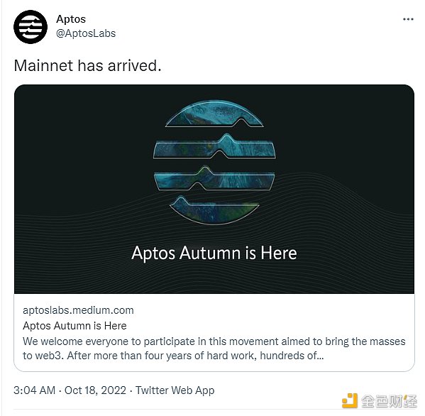 XRP/HKD+0.98%北京時間2022年10月18日凌晨,備受矚目的新一代公鏈Aptos宣布主網上線。