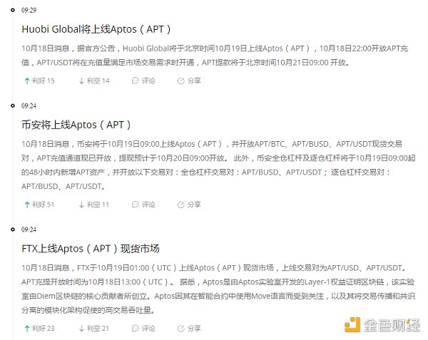 隨后,FTX、幣安、Huobi Global、Coinbase等多家一線交易所均在沒有任何代幣經濟學透明度的情況下,主動宣布上線Aptos代幣APT。