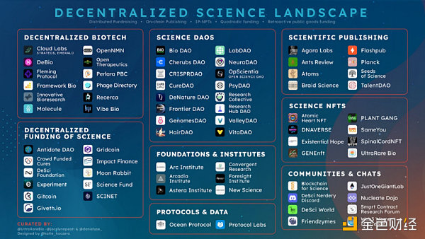 在本段中,選取了數個筆者所認為的較有代表性的DeSci項目,所評選的維度有:項目生態(市值、融資歷史、功能性、重要程度、合作方和孵化項目數量以及整體行業地位等),項目影響力(日活、社交媒體熱度等),項目更新頻率,項目上線時間,團隊情況等。目前WIKI收錄了較為完整的DeSci生態(如下圖),整個DeSci賽道還處于非常早期,而在目前的DeSci的生態版圖中,以DAO為最繁榮,這應該是由于DAO是為了解決目前DeSci最大也是最需要直面的融資難題。其次也是專注于去中心化融資的板塊,然后是為了解決DeSci第二大難題的同行評議的痛點的出版和論文文獻審核平臺概念。而其他的如NFT相關的組合概念,都還處于比較蠻荒早期的狀態。目前的DeSci項目里傾向于生物賽道的最多,這可能是由于本身科研生物方向本身的數量較多導致的以及近期疫情因素普遍公眾對生物科學的關注度提高有關。
