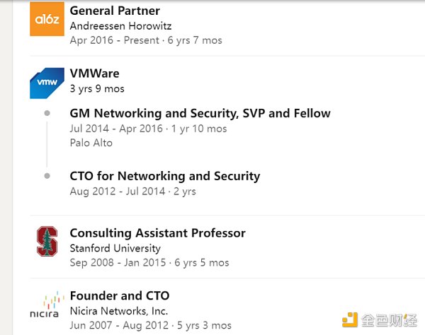 以下是 Martin Casado 的大致經歷,在 Nicira 創業之前,他是斯坦福的 PHD,筆者會經常 Track 一些學術 + 創業背景都有的投資人的動向(比如說他們投了什么新鮮玩意?為什么?他們社交網絡會發什么研究文章?),因此偶爾會發現一些值得觀察的方向。