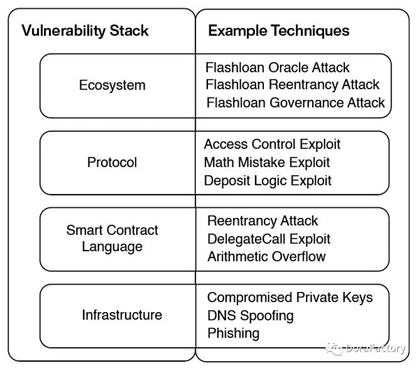 這一層的黑客利用了 Solidity 等智能合約語言的弱點。智能合約語言中存在眾所周知的漏洞,例如可重入性和錯誤的委托調用實現的危險,可以通過遵循最佳實踐來緩解這些漏洞。
