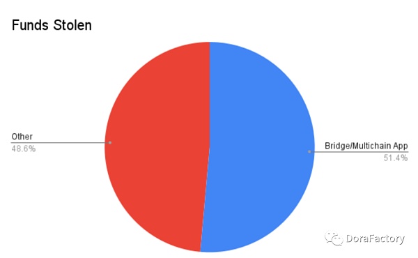 涉及跨鏈橋或多鏈應用的黑客(如多鏈交換或多鏈借貸)對數據集有巨大影響。盡管只占事件的10%,這些黑客占了25.2億美元的被盜資金。