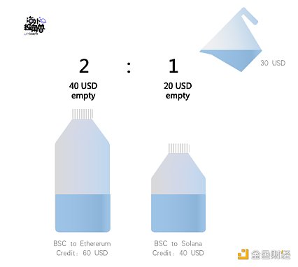 如下圖舉例,將 BSC 和 Solana 上的 USDC 跨鏈到以太坊上時由自己對應的流動性池,相互獨立、深度各有不同。所以,即使以太坊上總共有 300 USD 可被取出,從整體的數量上恰好能夠滿足來自 BSC 的 150 刀和 Solana 的 150 刀跨鏈請求,但因為 BSC- 以太坊和 Solana- 以太坊的池子不共用流動性,所以 BSC 的請求被拒絕。