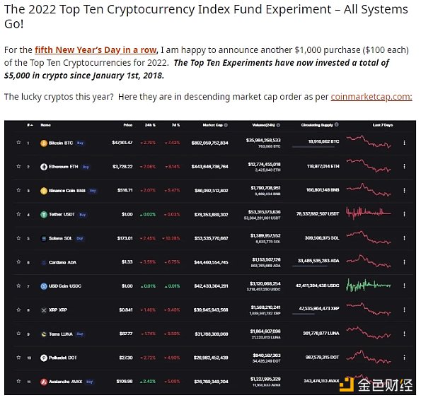 因此,從 2018 年開始,Greene 在每年 1 月初在 CoinMarketCap 上編制了一份排名前 10 位的加密貨幣清單,并隨著時間的推移跟蹤它們的表現。