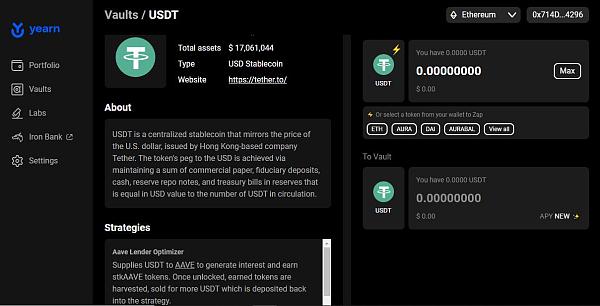 單擊資產圖標時,將打開特定的保險庫頁面,可以在其中找到更多信息,例如與保險庫相關的投資策略描述。 每個 yVault 可以同時處理 20 個策略。