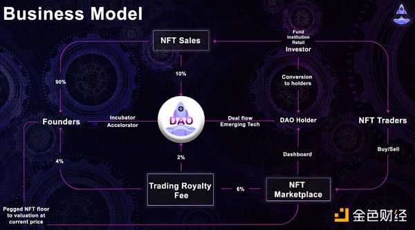 每個項目的創建都將創建一個系列的 NFT 來進行該籌款活動。該類行為我們統稱為 INO(Initial NFT Offering) ,NFT 公募將為提議的項目提供資金。NFT 將為意向投資者提供早期投資該產品的機會。其中 NFT 銷售所得資金的百分之九十將由募資項目獲得,而其余的百分之十則回到 The Science DAO 作為資金儲備。而 NFT 交易中設置有百分之六的版稅,其中百分之四歸項目方所有,百分之二歸社區。