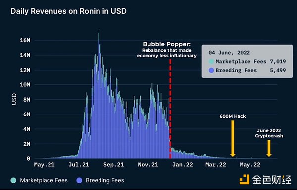 GameFi的代表產品之一「Axie infinity」就是如此,游戲設計本是長線的,但隨著游戲內經濟問題不斷出現,收益不斷下降,引發大規模玩家和價值外流,仍留在游戲內的玩家收益也受到影響,這導致游戲的日收入從均800萬美元跌至僅1萬美元,活躍賬戶從100萬峰值下降到5萬左右。