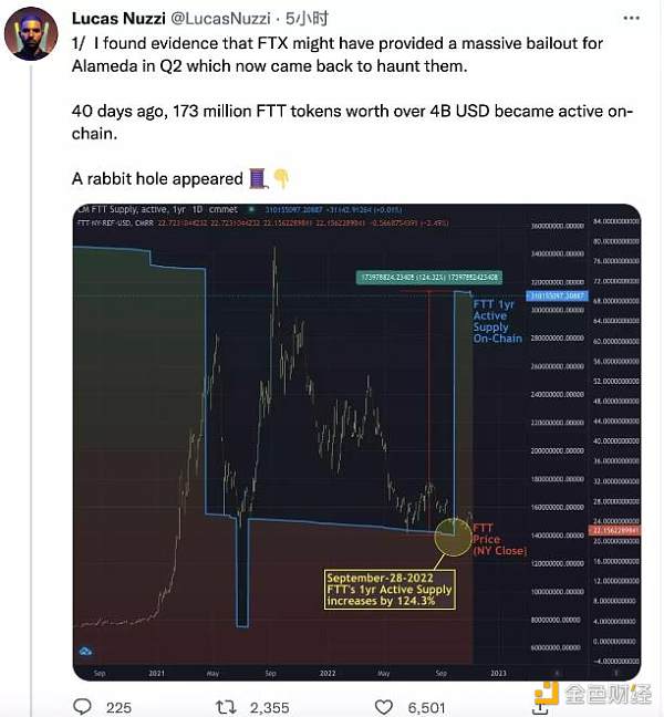 實際上,Alameda和FTX從今年二季度時已經到了危機時刻,CoinMetrics研究主管Lucas Nuzzi在推特上分析稱,挪用用戶資金的原因或為FTX在2022年第二季度為Alameda提供了大規模救助。通過數據分析表示,Alameda在今年第二季度時與三箭資本等一起到了崩潰邊緣,它之所以幸存下來,是因為它使用保證在4個月后釋放的1720萬枚FTT作為抵押品從FTX獲得資金,一旦釋放,所有代幣都被退回作為還款。