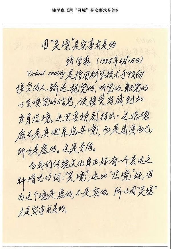 1998年6月18日,87歲的錢學森寫了一篇短文《用“靈境”是實事求是的》,其中寫道:“我們傳統文化正好有一個表達這種情況的詞‘靈境’;這比‘臨境’好,因為這個境是虛的,不是實的。”