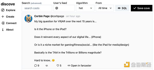 通過這個系統,Farcaster可以更深入地關注應用層。應用程序是人們用來與Farcaster網絡交互的程序,這意味著用戶可以隨時在應用程序之間切換,選擇他們最滿意的。這些應用程序的復雜性各不相同,有些應用程序可能只發布新消息或查看其他應用程序發布的消息。而其他應用程序可能會建立數據索引,并啟用搜索、算法feed和垃圾郵件檢測。在Hub本身上執行這些功能很困難,成本也很高。