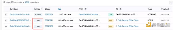 今早 4:28 pNetwork 發布公告消息,稱其原跨鏈橋協議有安全問題,因此要部署新合約,強調了已發快照空投,并呼吁大家不要去 PancakeSwap 池子交易。但其實 4:13,4:27 分,就有地址在鏈上增發分兩次增發了約 556 億枚 pGALA,這是誰干的呢?