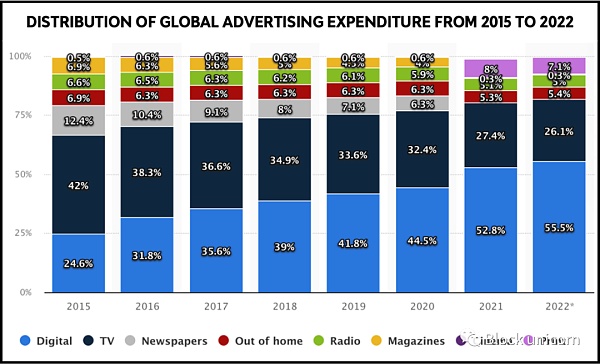 這種下降反過來反映在廣告支出上,電視總支出從42%下降到26.1%的市場份額。另一方面,數字(網絡、移動、社交、OTT等)的份額已經翻了一倍多,從24.6%的市場份額上升到55.5%的市場份額,歷時八年。