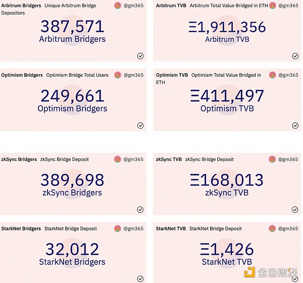 在過去的一年,我們有相當數量的用戶已通過跨鏈橋訪問了 L2。以下是 Arbitrum、Optimism、zkSync 以及 StarkNet 的生命周期統計數據。