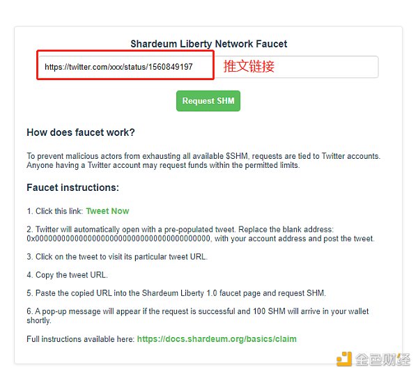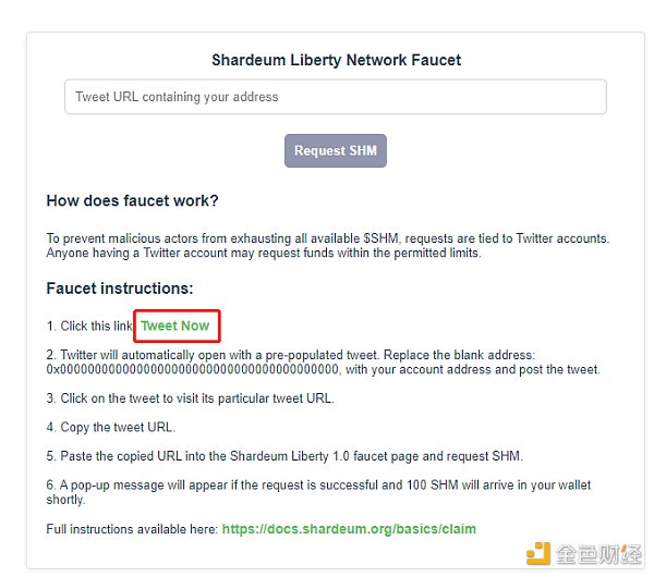 2.前往https://faucet.liberty10.shardeum.org/領水,打開頁面,點擊Tweet Now,彈點擊Okay,跳轉到推特,將最方框的地址替換為你自己的地址,然后發推文,點擊推文,將粘貼領水貼的鏈接輸入,復制到該鏈接測試推文