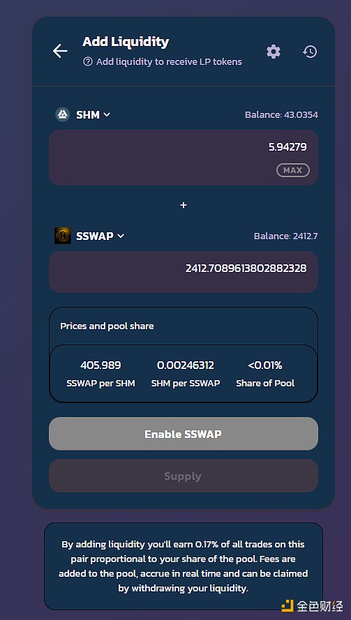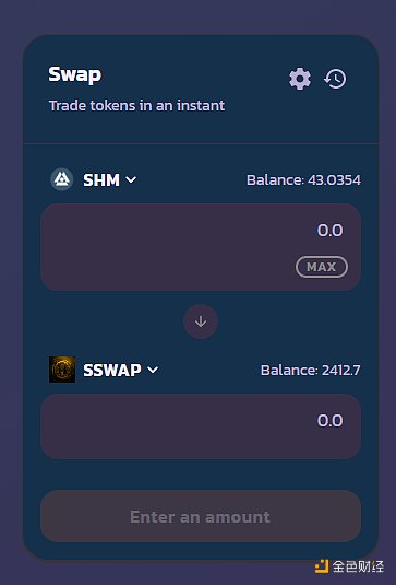 3.前往官方dex https://dex.shardeumswap.finance/swap,連接錢包,左上角選擇交易,將SHM兌換成SSWAP,可以來回多次交易