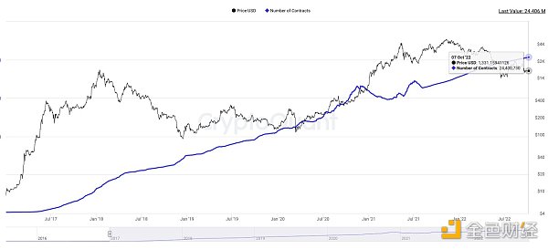 衡量 ETH 增長多少的一種方法是查看部署的智能合約的數量。截至撰寫本文時,網絡上有大約 2400 萬個智能合約。大約是 2017 年反彈期間的 300 萬的八倍。