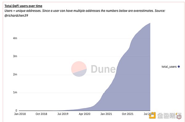 Richard Chen 的這張圖表顯示了 DeFi 的指數增長速度。從 2019 年 1 月的約 4000 用戶到今天的 470 萬。這不包括所有較新的DeFi 原語。DeFi 擁有約 1000 萬用戶,占網絡用戶群的 0.3% 以下。