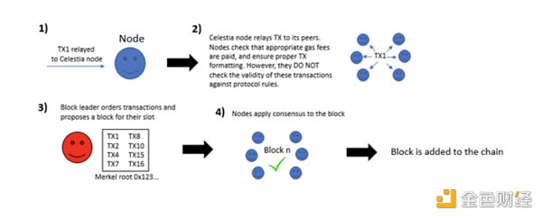 Celestia 采用了鏈下的方式來實現 DA,即通過 Reed-Solomon 糾刪碼以及專門的 Namespaced Merkle Trees 結構來確保數據的可用性,讓 DA 變得更便宜并以更有效的方式進行。具體的 Celestia DA 的工作方式如下: