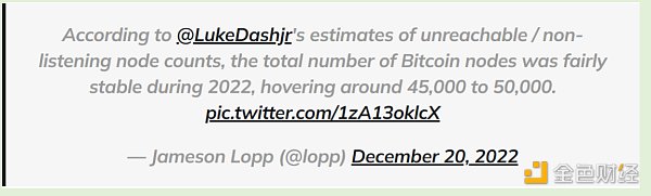 2022年比特幣節點數量保持穩定。我想說,這是由專心致志的運營者(包括我自己)組成的一個非常強大的運營商,無論匯率如何,我們將繼續為我們的自身利益運行節點。