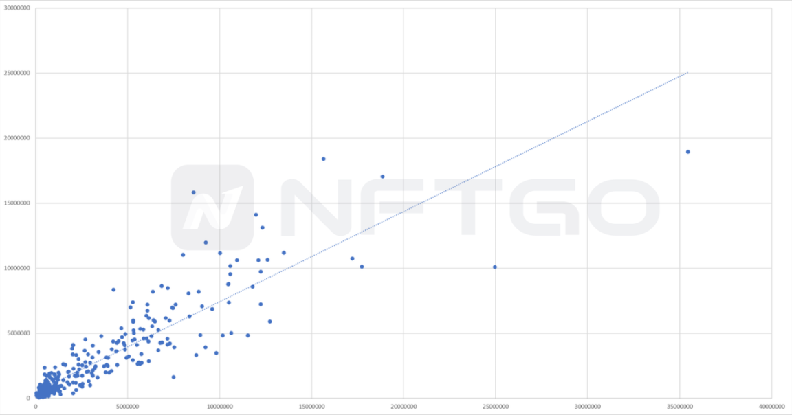 上圖為每日巨鯨資金的流入流出趨勢,其中巨鯨的每日買入量和每日賣出量的相關系數為 0.89,為強相關關系,巨鯨的買入賣出往往是一起出現,這也不難理解:當一個巨鯨買入 NFT 獲得浮盈時,他會賣出價值較高的 NFT,往往有另一個具有「巨鯨資金體量」的用戶買入對應的 NFT,賣家完成獲利,再次進行買賣循環的操作從而進行持續性的盈利。