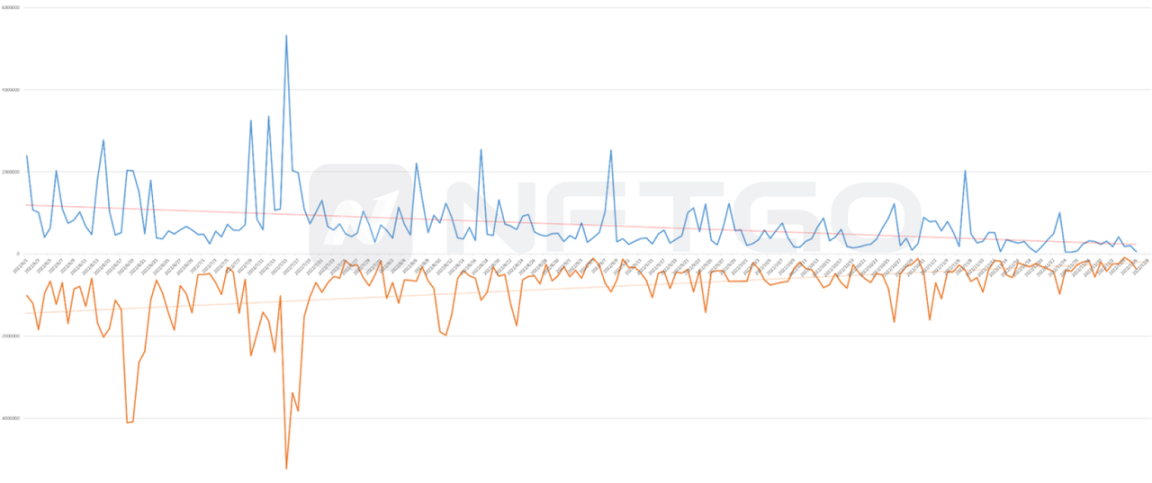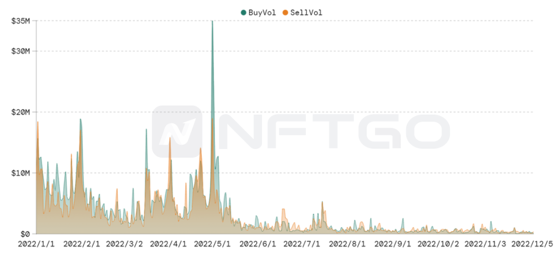 在 5-6 月份,受到總體市場的影響,巨鯨大大縮減了在 NFT 市場上的資金流動規模,買入資金和賣出資金開始從 6 月的 3000 萬美元穩步下跌至 12 月的 1000 萬美元,趨勢線呈線性下降的形狀。