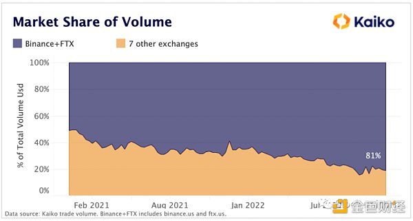 雖然收購似乎已經全部夭折,但一個 Binance+FTX 的巨無霸究竟會是什么樣子?自 2021 年開始,相對于 11 個流動性最強的交易所,Binance 的市場交易量份額已從 47% 攀升至 71%,它的總交易量比其他所有交易所的總和還要大。
