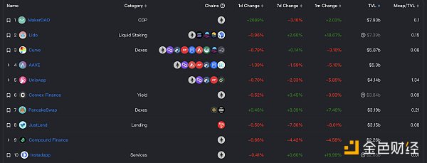 DeFi項目鎖定資產前十排名及鎖倉量 數據來源:defillama