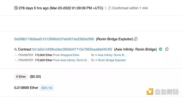 3 月 23 日,Ronin Bridge 遭到黑客攻擊,攻擊者通過控制九個驗證節點私鑰中的五個(4 個 Sky Mavis 和 1 個 Axie DAO)從而盜取大約 6.5 億美元資金(173,600 枚 ETH 和 2550 萬枚 USDC)。