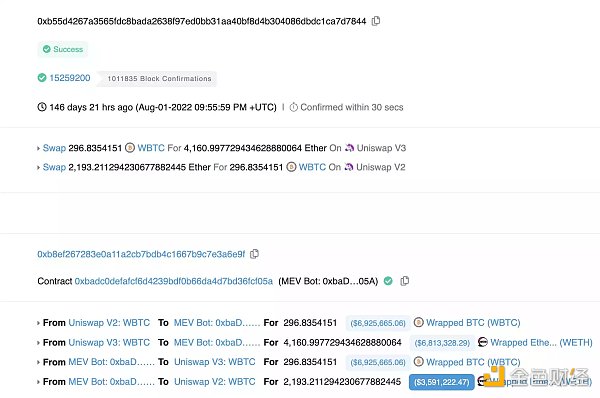 8 月 1 日,0xB8Ef 開頭地址在一筆交易中獲利 3,319,854.98 美元,僅向礦工支付了 2,090.18 美元,這是一次在 Uniswap V2 和 V3 池之間的成功套利,也是 flashbots 捕獲的最大 MEV。