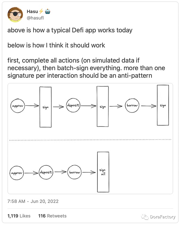 1、多呼叫功能的實現:目前,在與以太坊區塊鏈交互時,您必須為每個操作進行新的交易。有了抽象,所有交易都可以一鍵完成,節省了用戶的Gas、時間。