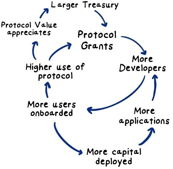 既然大家都明白協議需要建立在其上的實際應用,那么協議如何才能激勵有價值的項目建立在其上?如何為激勵計劃創造價值飛輪?