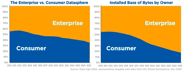 企業在數據圈管理領域的重要性不斷增長,消費者所生成數據的份額從2017年的47%下降到2025年的36%。這種轉變很大程度上是由不斷變化的、始終被“傳感狀態”的世界所驅動的。我們的環境不斷被捕獲分析,并全天候(24x 7 )不間斷地被創建。過去消費者對自己的大部分數據負責,但是隨著數據在企業核心和邊緣基礎設施中變得越來越集中,維護和管理數據的責任正在轉移到企業/云提供商數據中心。企業已經是數據創建和存儲的主要來源和管理者,并且這種趨勢會繼續強化這些責任(圖6和7)。