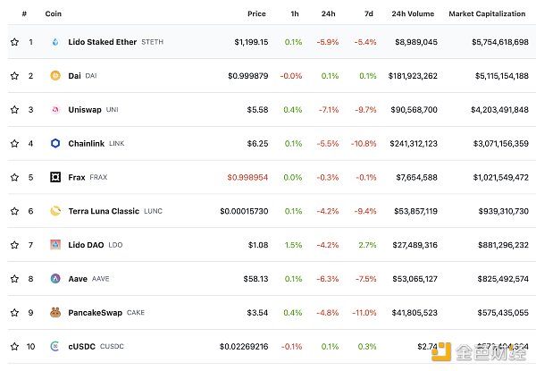 DeFi總市值及前十代幣 數據來源:coingecko