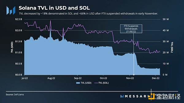 坦率地說,Solana DeFi是受FTX崩盤影響最大的一個分支領域。Solana DeFi上的總鎖倉量因受Alameda牽連而遭受巨大打擊,SOL的價格下跌了67%。