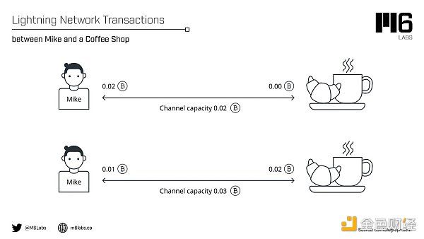 Mike可以使用閃電網絡與咖啡店建立支付通道。每筆咖啡購買都可以通過該通道跟蹤,咖啡店仍然可以獲得付款。這樣的交易速度快,成本低,甚至可能是免費的。然后,Mike可以決定在啟動通道的比特幣被使用后關閉通道或重啟通道。通道一旦關閉,交易就會被添加到比特幣主鏈。