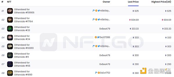 Otherdeed 5月份交易價格排行榜(Source: NFTGo.io)