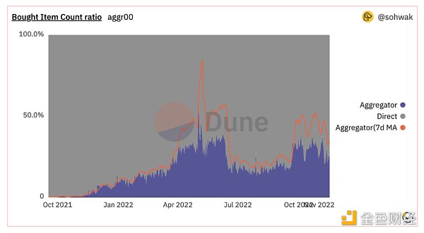 下面的數據顯示,大約 33% 的 NFT 是通過聚合器購買的,Blur 推出前,Gem 交易約占之前所有聚合器市場份額的 70-80% 。