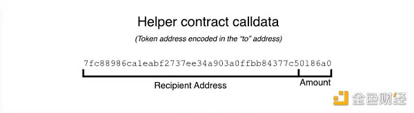 然而,我們可以假設大多數用戶都在轉移同樣的幾種 Token(WETH,Dai,USDC)。所以,從調用數據中刪除整個 Token 地址的其中一個方法是為該 Token 部署一個特殊的「助手」合約。如果我們可以把交易發送給這個助手,就完全避免了發送 Token 地址的必要。