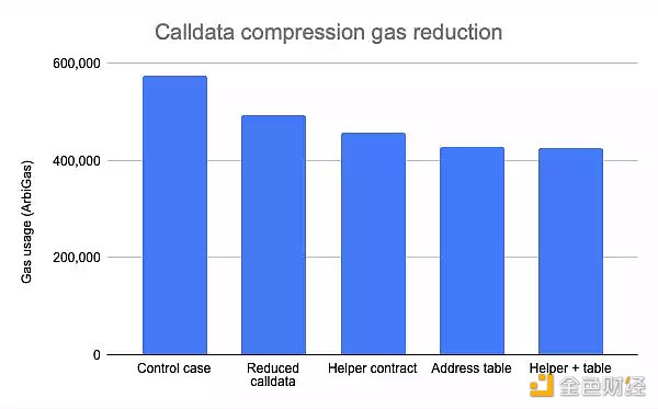 全部加在一起,我們的調用數據大小現在只有 6 個字節了。最后的測試交易使用了 426,529 ArbiGas(也比對照組減少了 26%,比之前的測試組略低),花費 0.32 美元。