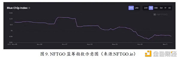 從數據分析平臺NFTGO上可以看出,過去幾天藍籌指數大幅下跌。而我們知道,構成Blue Chip NFT類別的NFT系列包括BAYC、Cool Cats、CryptoPunks、Art Blocks 和 CloneX等頂級藍籌。自 11 月 7 日以來,該指數下降了 6% 。(如下圖所示)