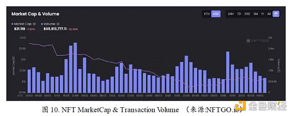 除了藍籌指數下跌外,NFT市場的總市值和銷量均出現了下降。NFTGo數據顯示,自 11 月 7 日以來,NFTs市場總市值下跌 8% ,同期總銷量下降了 32% 。