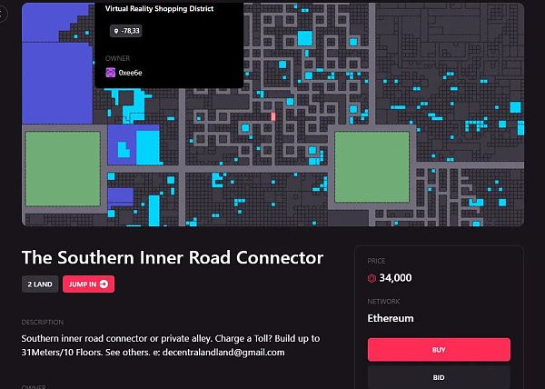 Decentraland是一個去中心化的游戲。它基本上是一個DAO(去中心化自治組織),代幣持有者在這里管理游戲。我喜歡稱它為元宇宙的OG,它是第一個元宇宙平臺/市場。我們可以在Decentraland上購買或出售土地。藍色突出部分顯示的地塊是待售地塊,當我們在它們周圍徘徊時,就會看到它們的價格,誰在出售它,以及土地有多大。